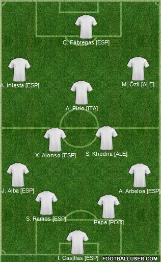 Casillas; Arbeloa, Pepe, Ramos, Alba; Khedira, Alonso, Pirlo; Özil, Iniesta y Fábregas.